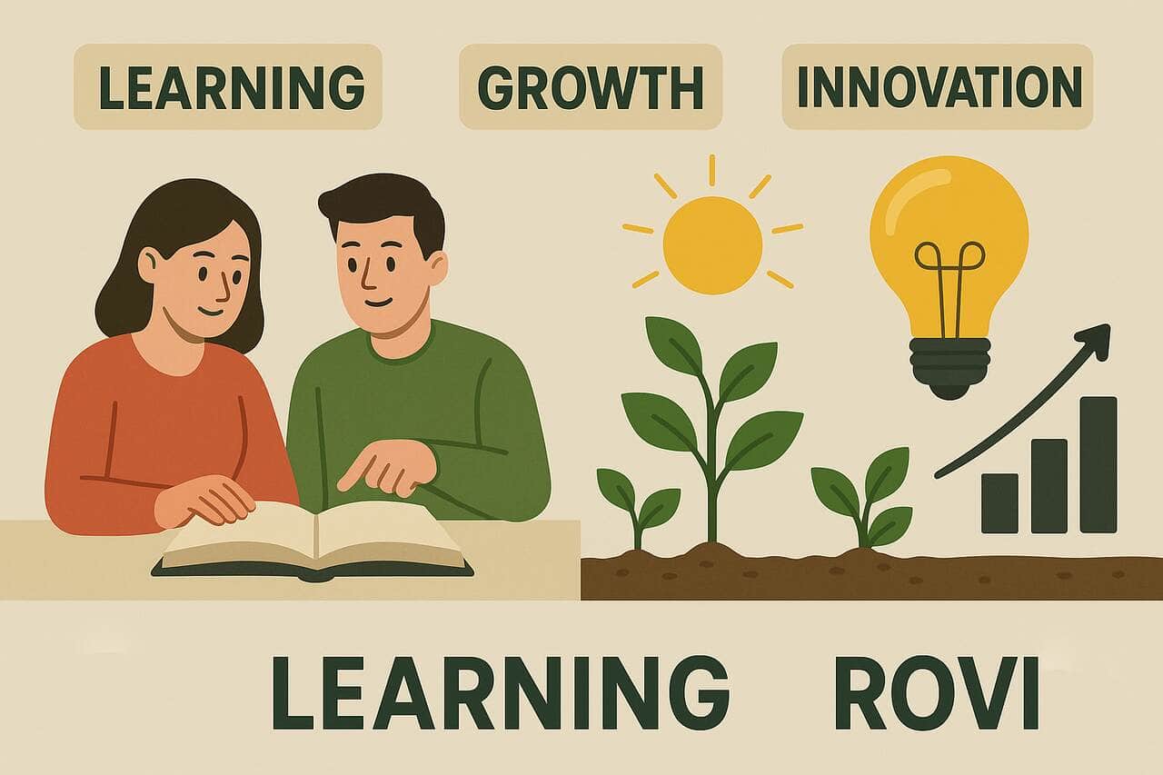 Duaction visual with dual actions driving growth, learning, and innovation.